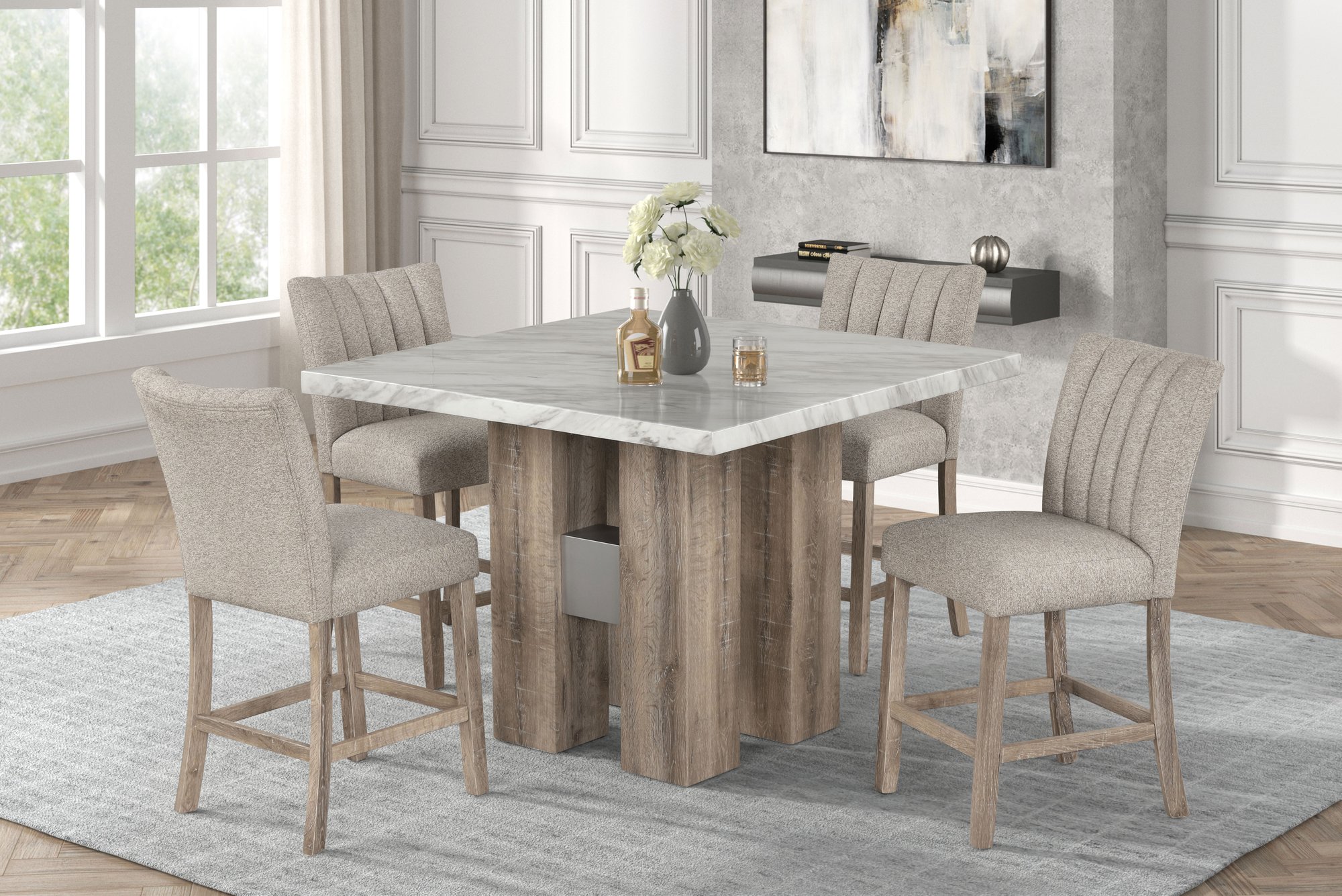 - UPHOLSTERED PUB CHAIRS IN NEUTRAL BEIGE COLOR TEXTURED FABRIC FOR A CLEAN, MODERN AESTHETIC.