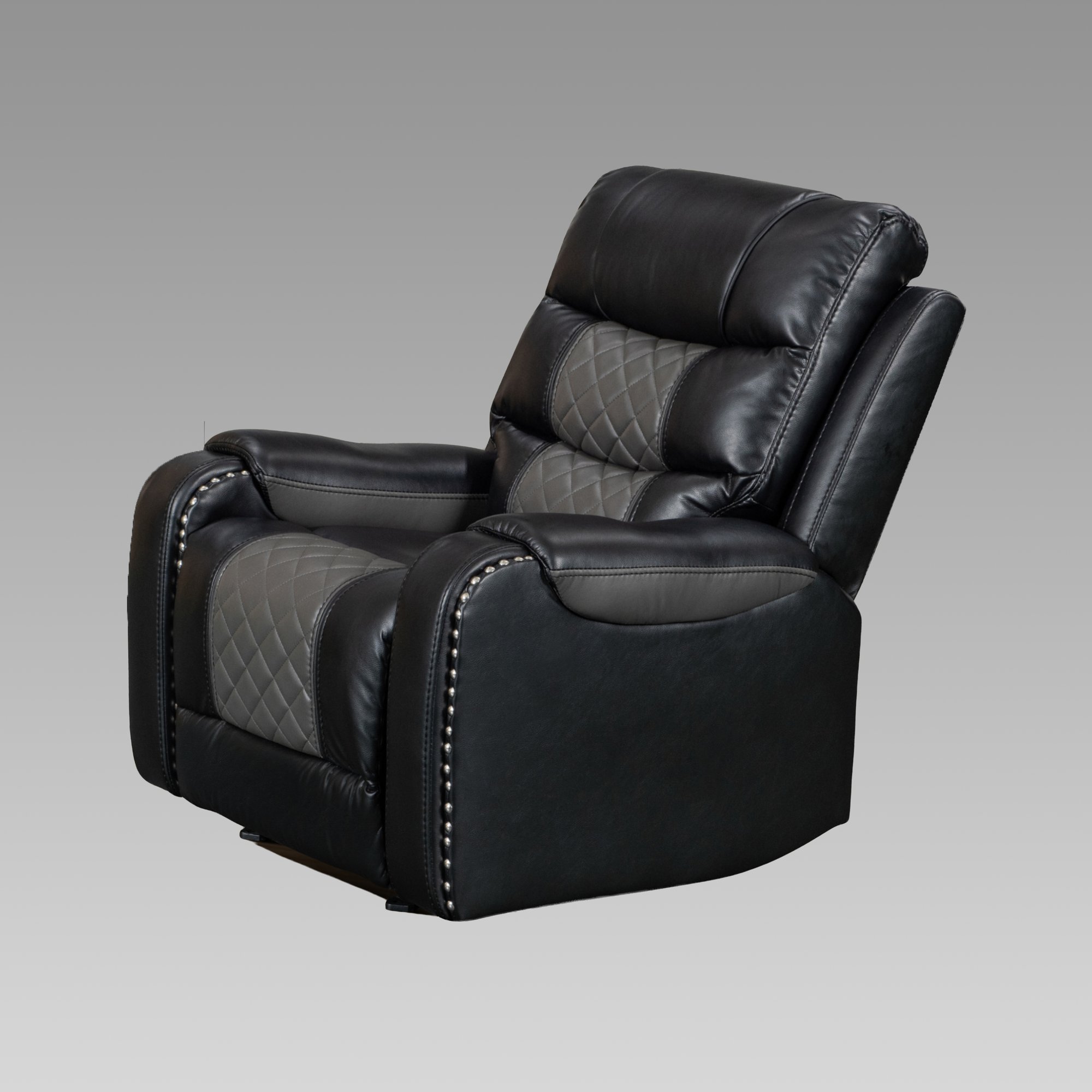 FEATURES: - MANUAL RECLINER IN A TWO TONE BLACK PU COLOR FABRIC WITH CONTRASTING GREY DIAMOND QUILTING ON SEATS AND BACKS. - CONTRAST NAIL HEAD. - AVAILABLE IN A SOFA & LOVESEAT SET.